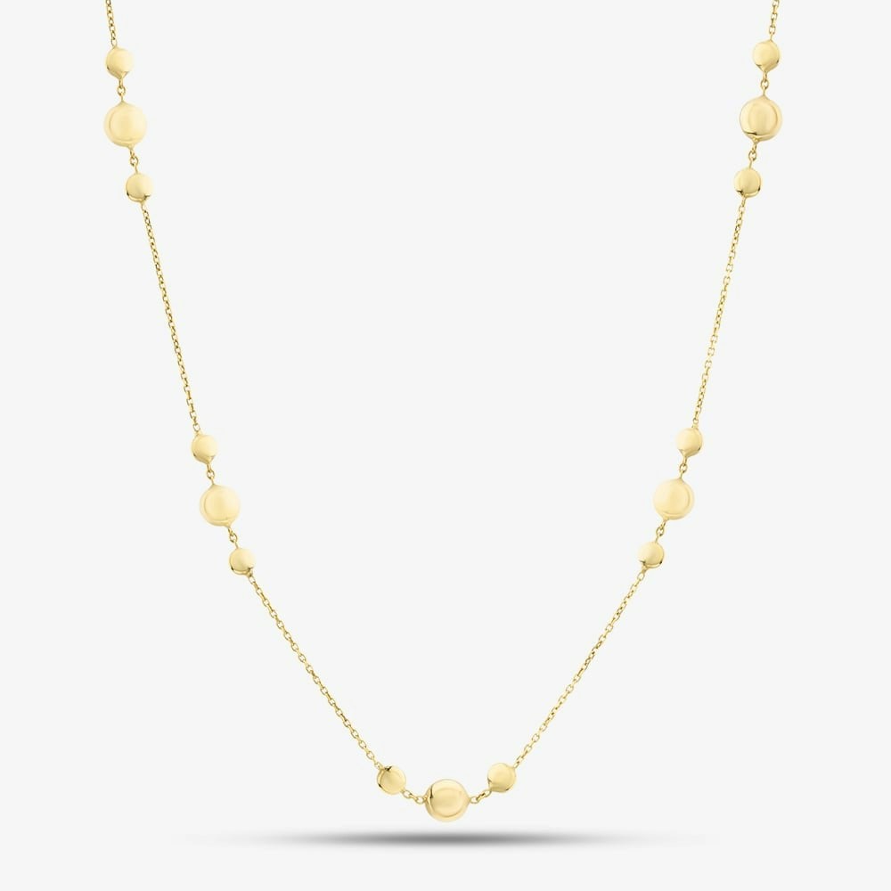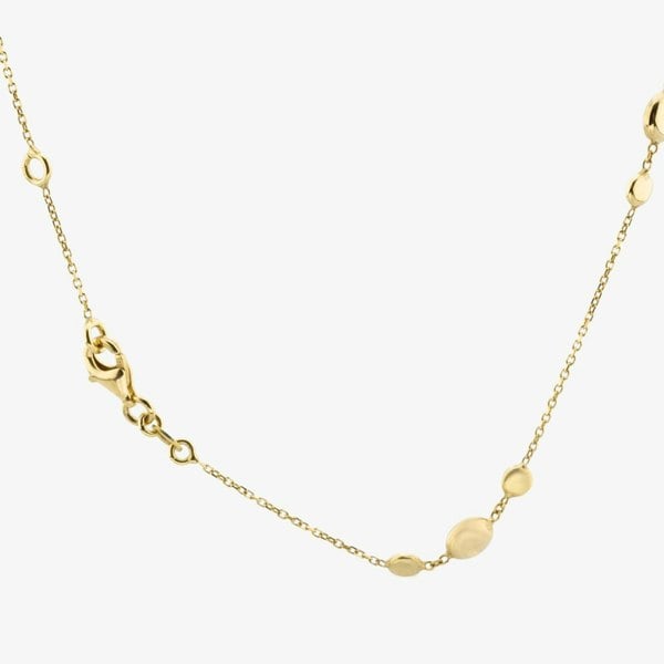 Crafted in 9ct yellow gold, this elegant necklace features a combination of asymmetric, differently sized, highly polished pebbles which adorn a delicate trace chain.