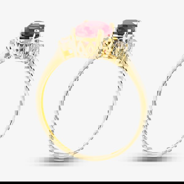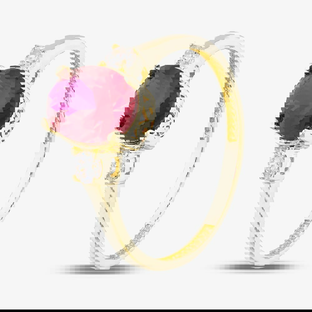This stunning 9ct gold trilogy ring features a rich, oval-cut red cubic zirconia as the centre stone, offering a bold splash of colour. On either side, two smaller brilliant-cut white cubic zirconia stones add sparkle and balance, creating a timeless and elegant look. A meaningful design that represents the past, present, and future, perfect for gifting or elevating your everyday style.