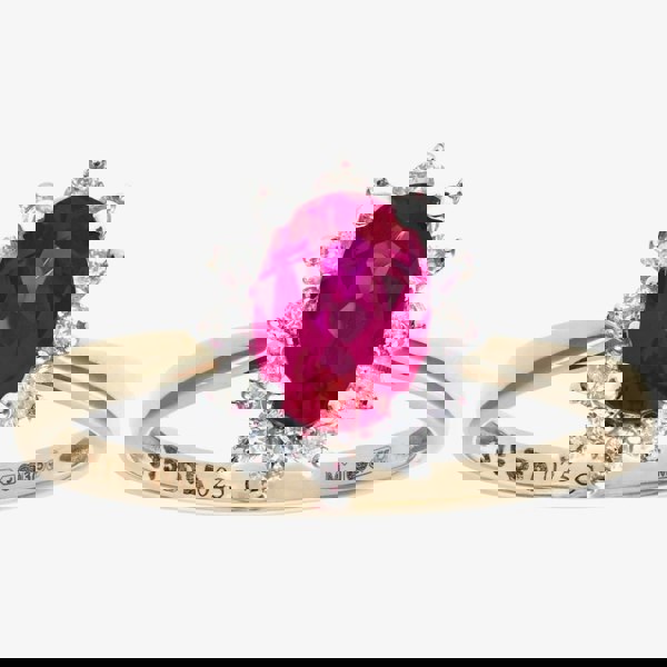 This beautiful cluster ring is crafted in 9ct yellow gold & features an oval ruby centre stone with a sparkling diamond surround which has a total carat weight of 0. 25ct. This ring is a perfect stand-alone piece or ideal for layering & combining with other rings to create your own unique look.