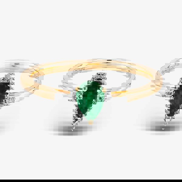 Gemstone cluster rings are a colourful and cost-effective substitute for more pricey diamond rings. A beautifully hued pear-cut emerald is framed by a halo of brilliant diamonds for a cut and colour contrast, all held in place by a clawed arched setting and supported by raised stone-set open shoulders.
