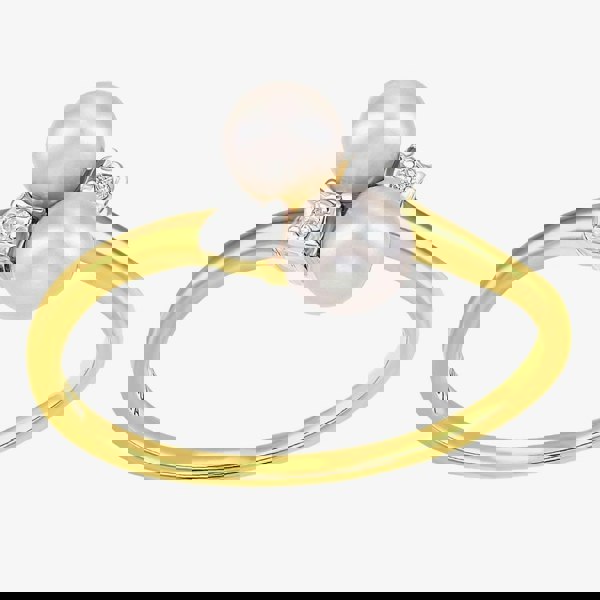 This modern dress ring is crafted in 9ct yellow gold & features two white cultured pearl centre stone with two sparkling diamonds either side which have a total carat weight of 0. 01ct. This ring is a perfect stand-alone piece or ideal for layering & combining with other rings to create your own unique look.