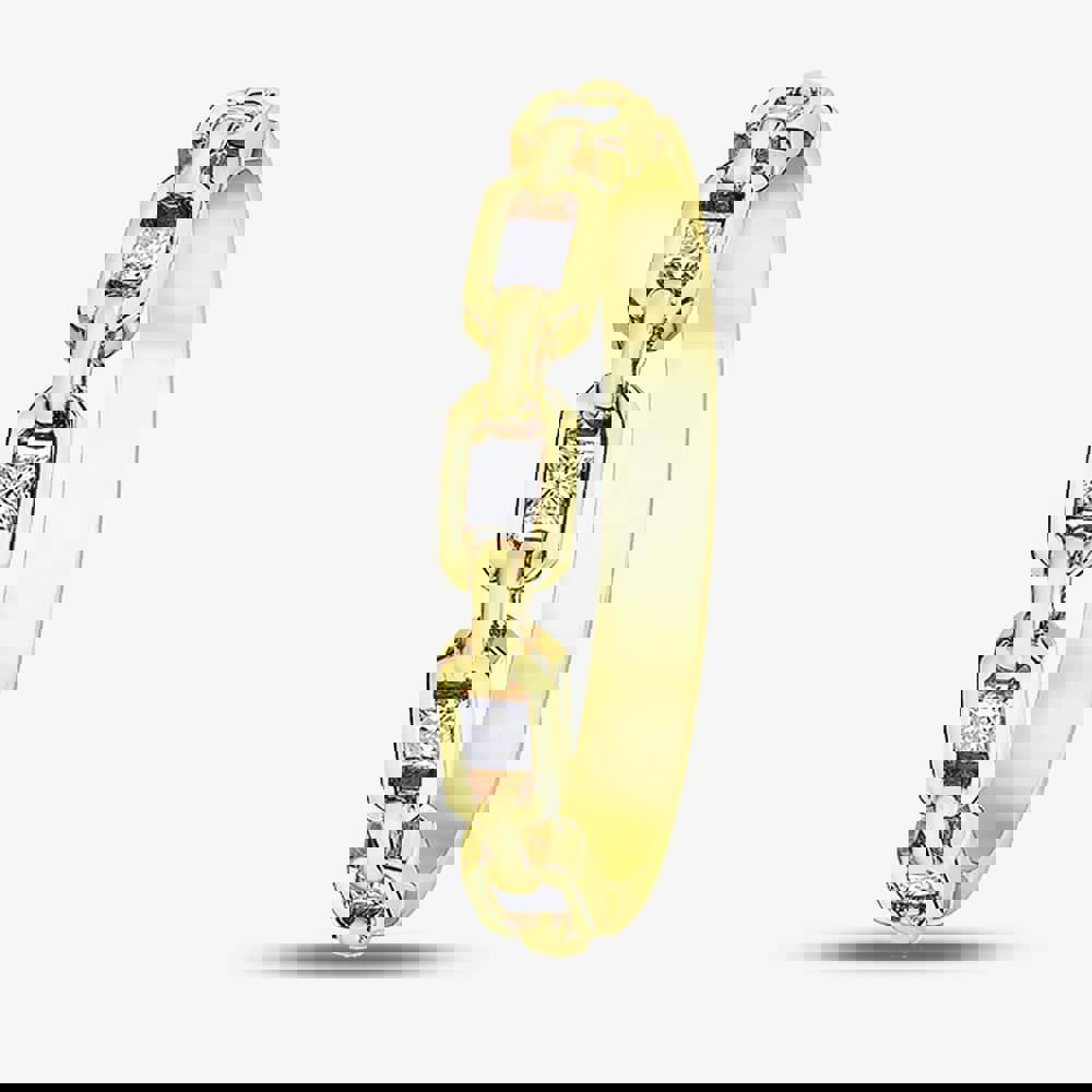 A modern half eternity style ring which is created in 9ct yellow gold & features an attractive open link design set with five sparkling princess cut diamonds which catch the light beautifully. Ideal as a stand-alone piece or perfect for layering or stacking with other rings to create your own unique look