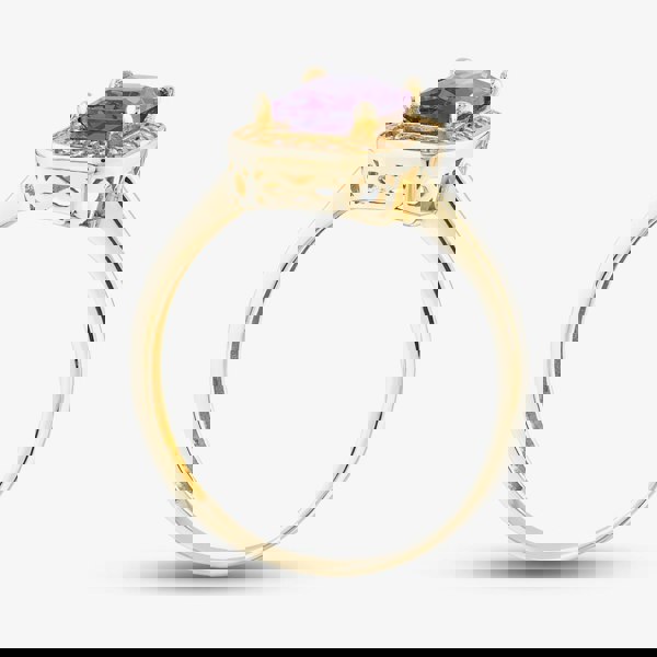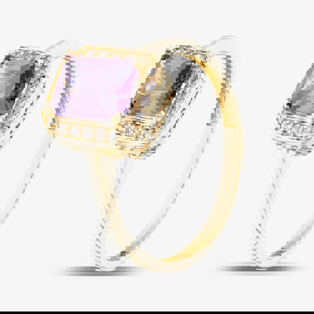 This stunning 9ct Yellow Gold Ring features a striking emerald-cut purple cubic zirconia stone at its centre, framed by a glittering halo of clear cubic zirconia stones. The bold, regal design is both timeless and eye-catching, perfect for adding a touch of sophistication to any look.