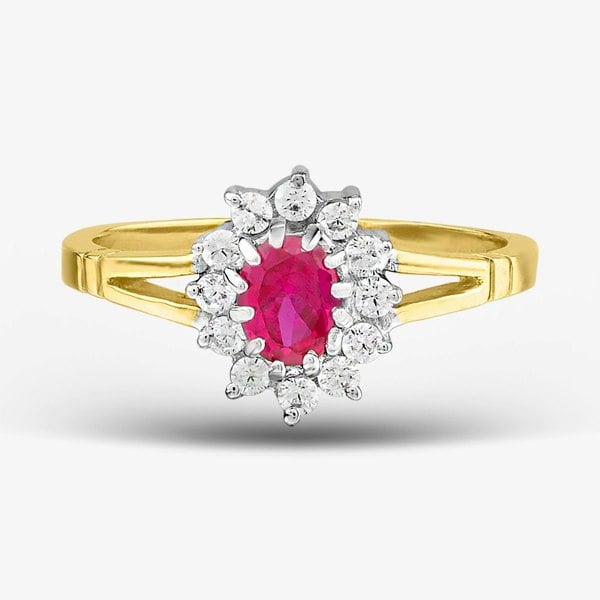 A simple yet classic cluster ring crafted in 9ct yellow gold with an oval red crystal centre stone, clear crystal surround and an open shoulder design. This ring glistens and catches the light beautifully, the perfect dress ring for that special occasion.