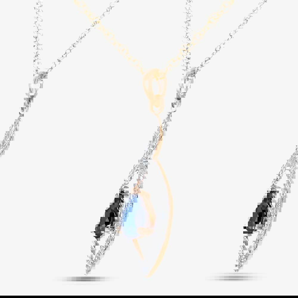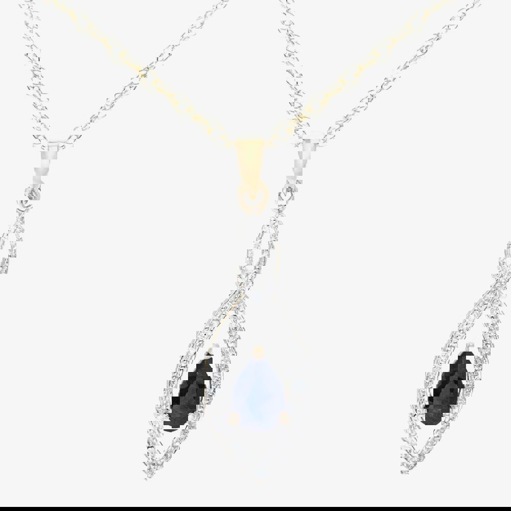Refined and luminous, the T. H. Baker PP03616Y SA pendant necklace is crafted in 9ct yellow gold and finished with a marquise-shaped pendant. At its centre sits a pear cut sapphire, framed by diamond detailing for a subtle sparkle that suits both everyday styling and more polished occasions. A Prince of Wales chain completes the look, bringing a classic finish that sits neatly at the neckline.