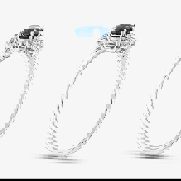 This elegant 18ct white gold three-stone ring features a striking oval-cut sapphire at its centre, weighing 1. 27 carats. It is flanked by two brilliant-cut diamonds with a combined weight of 0. 40 carats. The ring comes complete with certification, ensuring the authenticity and quality of its precious gemstones.