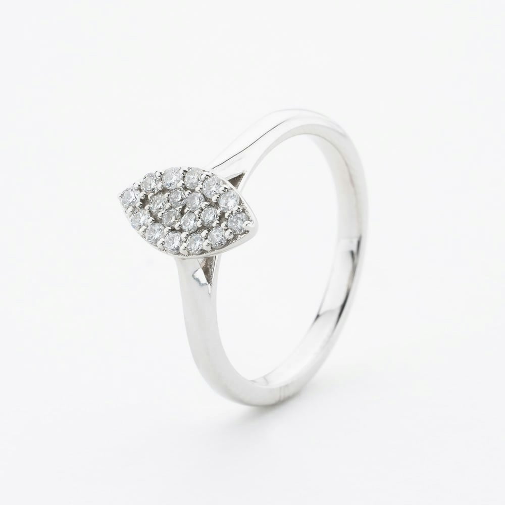 A delicate platinum ring showcasing a 0. 25ct marquise-cut diamond cluster. The sparkling diamonds are arranged to enhance brilliance and elegance, creating a timeless piece perfect for special occasions or everyday sophistication.
