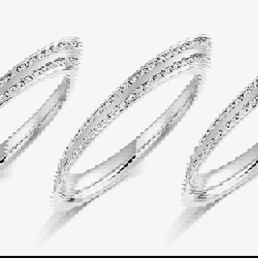 This sumptuous platinum court-profile wedding band is set with two full matching rows of diamonds, held in place by the tension provided by the two fine channels that run through the surface of the ring. perfect for those who enjoy that extra touch of sparkle, this cool-hued ring is sure to complement any diamond engagement ring.