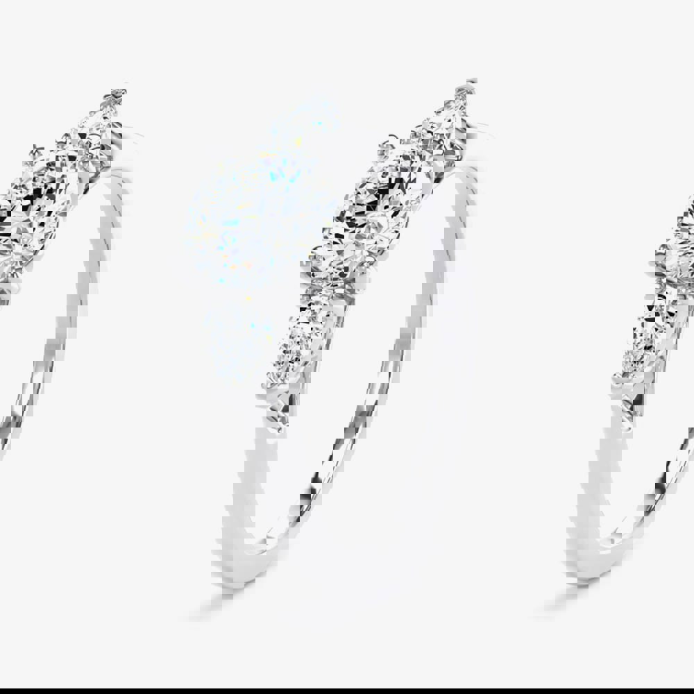 Crafted in enduring platinum, this exquisite three stone ring features a brilliant-cut diamond at its heart, elegantly flanked by two pear-cut diamonds. Totalling 0. 70 carats, the trio of perfectly matched stones captures timeless sophistication and radiant brilliance, a refined choice for engagements or lifelong elegance.