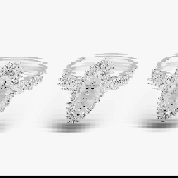 Delicately crafted in platinum, this shoulder-set halo ring exudes timeless elegance. It is adorned with a VS2 clarity, 0. 90ct brilliant-cut white centre diamond with a graded colour of G, accentuated with a halo of brilliant-cut white diamonds enhancing the centre stone, while the shoulders glisten with their diamond-encrusted brilliance, with a total diamond carat of 0. 40. Each stone, nestled in a classic four-claw setting, promises to sparkle with every movement, making this ring a timeless symbol of subtle luxury.