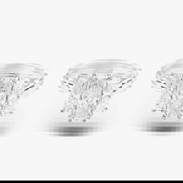 Crafted with a touch of simplicity, this three-stone ring exudes timeless elegance. The delicate platinum is adorned with an SI1 clarity, 0. 71ct radiant-cut white centre diamond with a graded colour of E, accentuated with a single radiant-cut white diamond set on each side, enhancing the centre stone, with a total shoulder carat weight of 0. 76ct. Each stone is set in a classic four-claw setting, and promises to sparkle with every movement, making this ring a timeless symbol of subtle luxury.