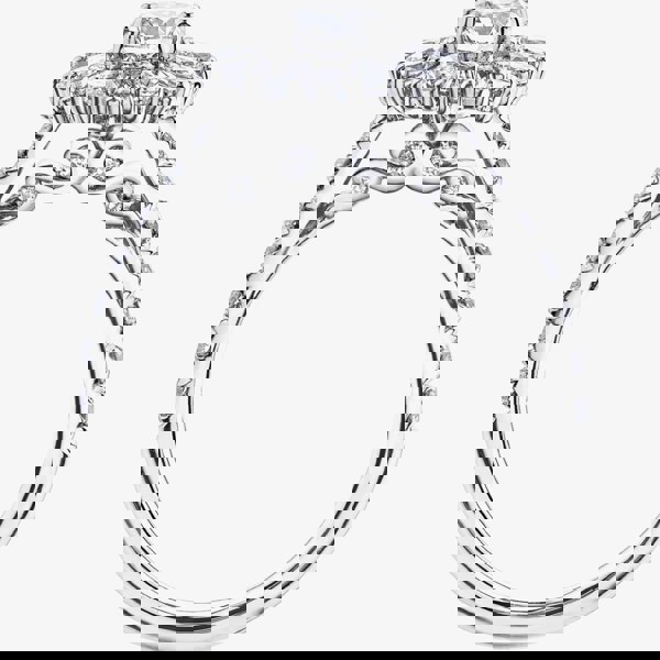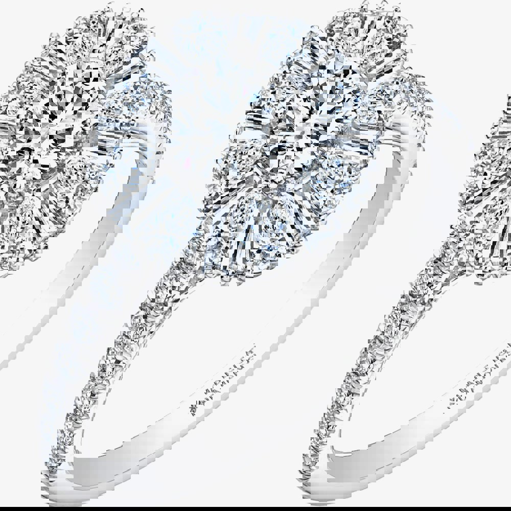 Created in Platinum, this luxurious ring combines a 0. 50ct diamond in the centre, framed with a sparkling halo of alternating pear shaped and tapered baguette diamonds. This ring has further diamonds set within the shoulders in addition to the bridged ring mount embellished with diamonds in a wave design, giving a total weight of 1. 50ct.