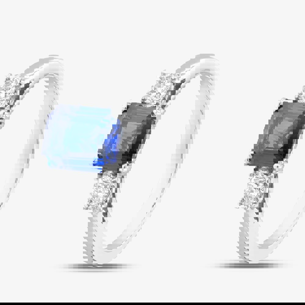 This elegant platinum shoulder set solitaire ring features a stunning 1. 61ct emerlac cut sapphire as its centrepiece. The sapphire's deep blue hue is beautifully complemented by two 0. 50ct round brilliant-cut diamonds on either side, adding exceptional brilliance and balance to the design. Set in a sleek and durable platinum band, the ring offers a modern yet timeless look, where the cool tones of the platinum enhance the vibrant sapphire and sparkling diamonds.