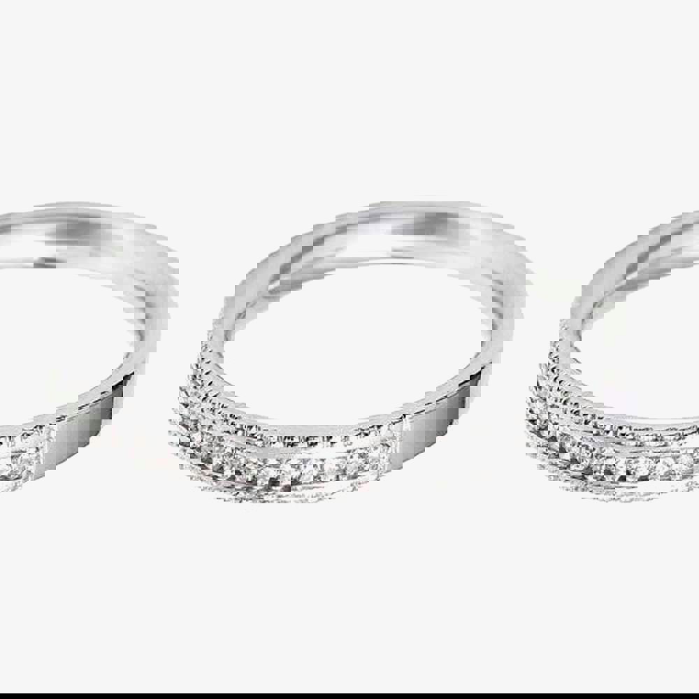 This stunning 3mm wedding band has been crafted from luxurious platinum, the leading metal in beauty and quality. Featuring grained edge detailing to accentuate its dazzling channel set diamonds and finished in a stylish flat court shape. The beautiful diamonds are brilliant cut with a colour of H and clarity SI for a radiant shine you will love to flaunt.