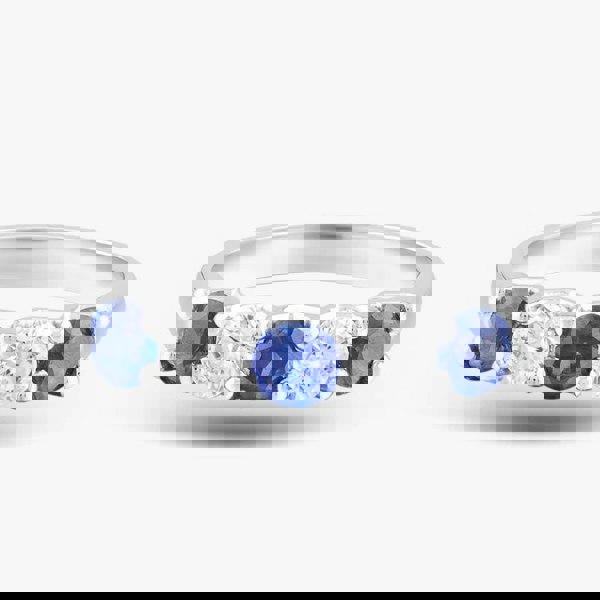This exquisite platinum half eternity ring showcases a sophisticated blend of five stunning gemstones. The ring features alternating 0. 72ct deep blue sapphires and 0. 43ct sparkling diamonds, creating a striking balance between the vivid sapphires and the brilliant white diamonds. Set in a sleek and durable platinum band, this elegant piece combines timeless beauty with contemporary luxury, making it a perfect symbol of everlasting love and style.