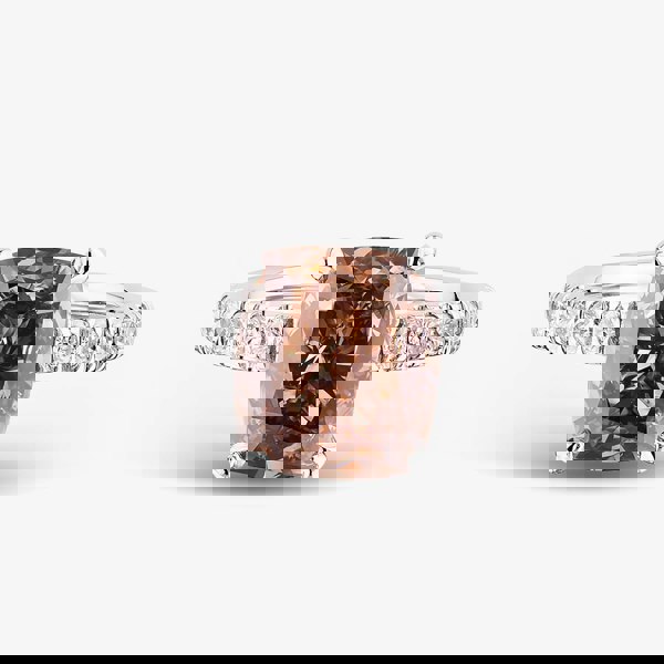 Exude elegance with this Fancy Vivid Brown-Pink Cushion Cut Lab-Grown Diamond Ring, a masterpiece of colour and craftsmanship. The radiant 3. 00ct pinkish brown centre diamond is compliment by a band shoulder-set with brilliant-cut white lab-grown diamonds totalling 0. 45ct, adding a subtle yet striking sparkle from every angle. Crafted in platinum, this ethically sourced, certified ring combines timeless sophistication with modern luxury. Perfect for marking a momentous occasion or adding a touch of refinement to your collection, it is a statement of unparalleled beauty and enduring style.