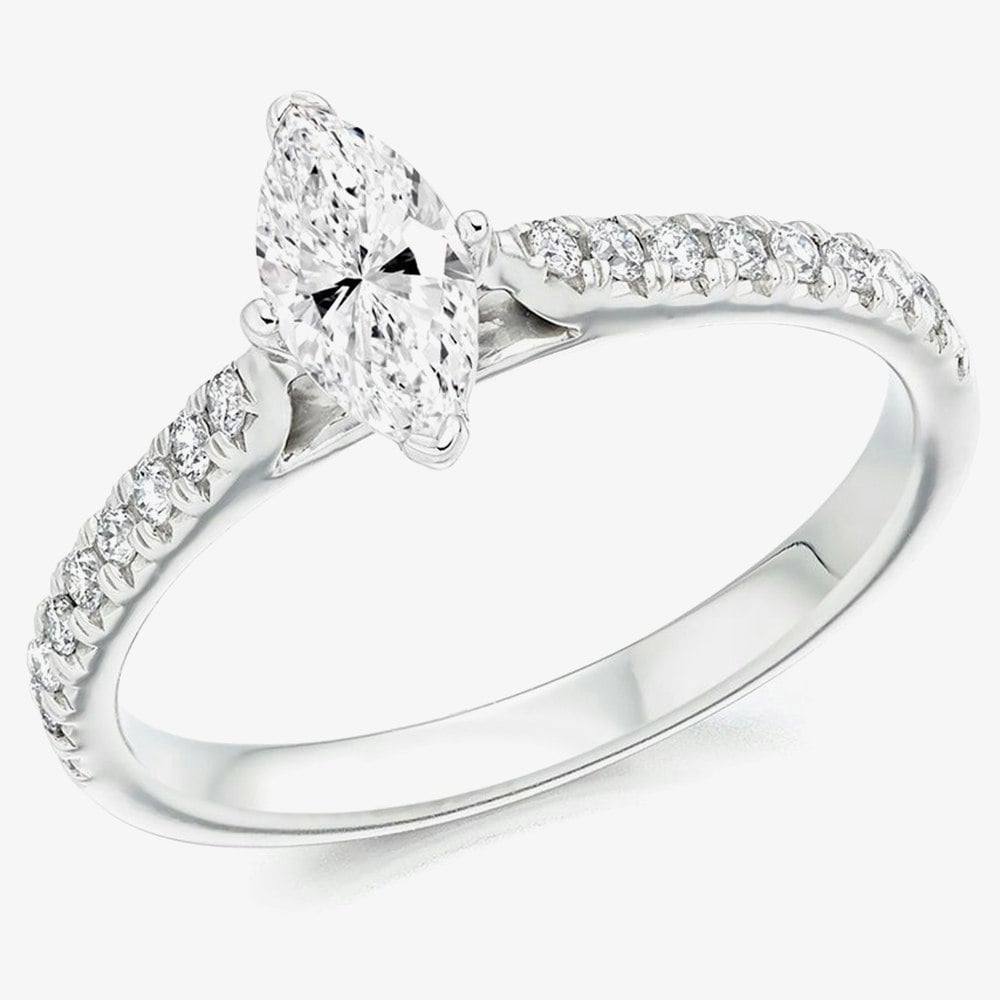 Offering an eye-catching, stunning addition to any bridal set with lots of sparkle, the Platinum Marquise-Cut Diamond-Shoulder Engagement Ring (L) features a 0. 40ct marquise cut centre diamond in a claw setting and 0. 20ct of round-brilliant cut shoulder diamonds in a micro-claw setting. Set on a platinum 950 band, this solitaire engagement ring with diamond encrusted shoulders is set to make sure you get a 'yes' and would pair beautifully with an eternity ring. Available in UK size L.