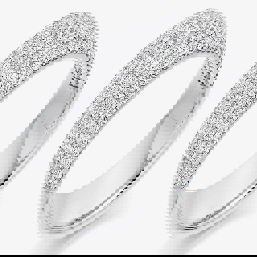 Offering a beautifully elegant addition to any bridal set, the stunning Platinum Pave Diamond Engagement Ring (M) features 0. 70ct of round-brilliant cut diamonds in a pave setting within a 4. 7mm wide platinum 950 band. With a 50% diamond coverage, this half-eternity ring would pair beautifully with a gemstone engagement ring. Available in UK size M.