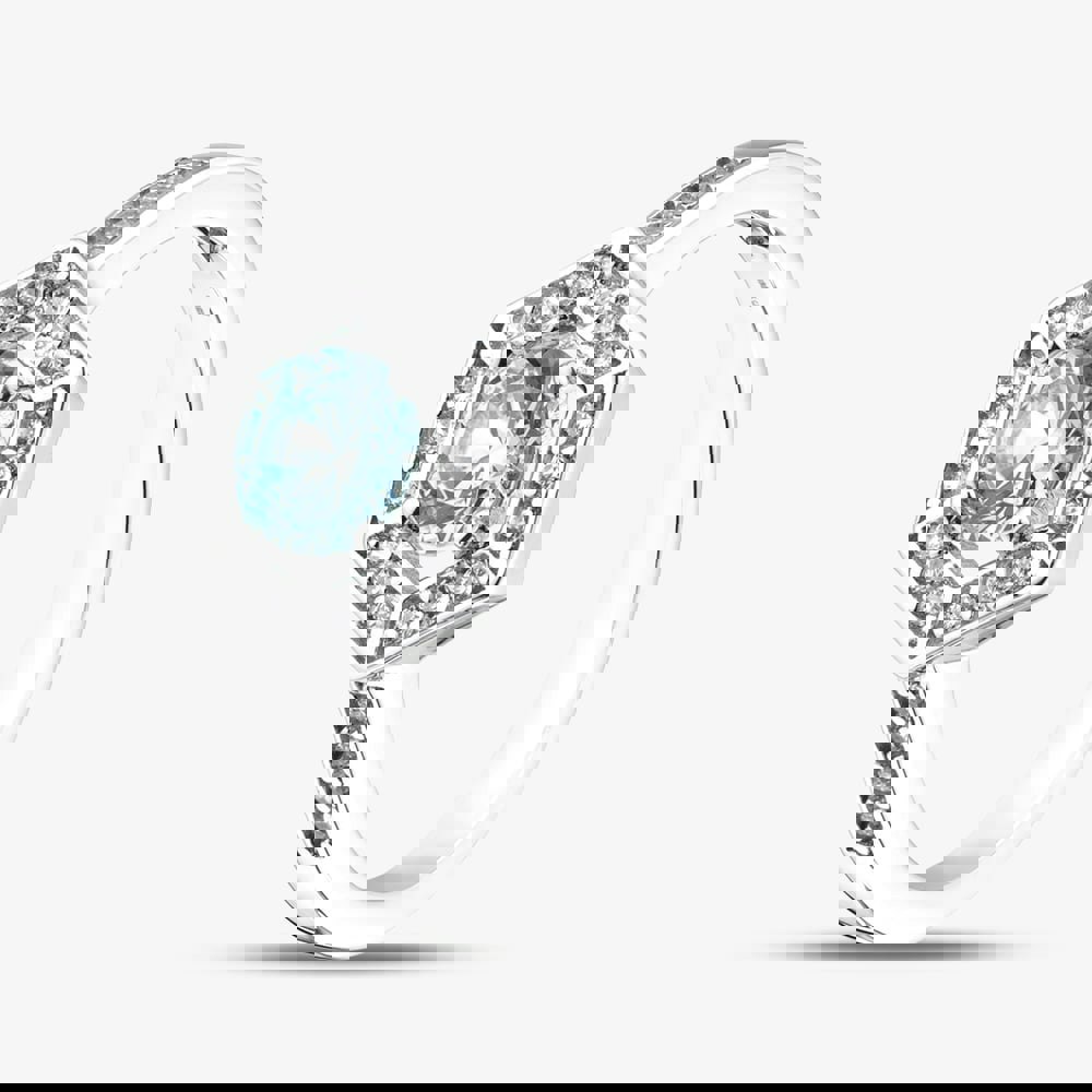 A halo of 26 white cubic zirconia stones frames the centre and continues down the shoulders, creating a bright, light-catching look across the band. Crafted in sterling silver and finished with a high-shine rhodium plating, it balances crisp sparkle with a cool-toned palette that suits both everyday styling and more polished occasions.