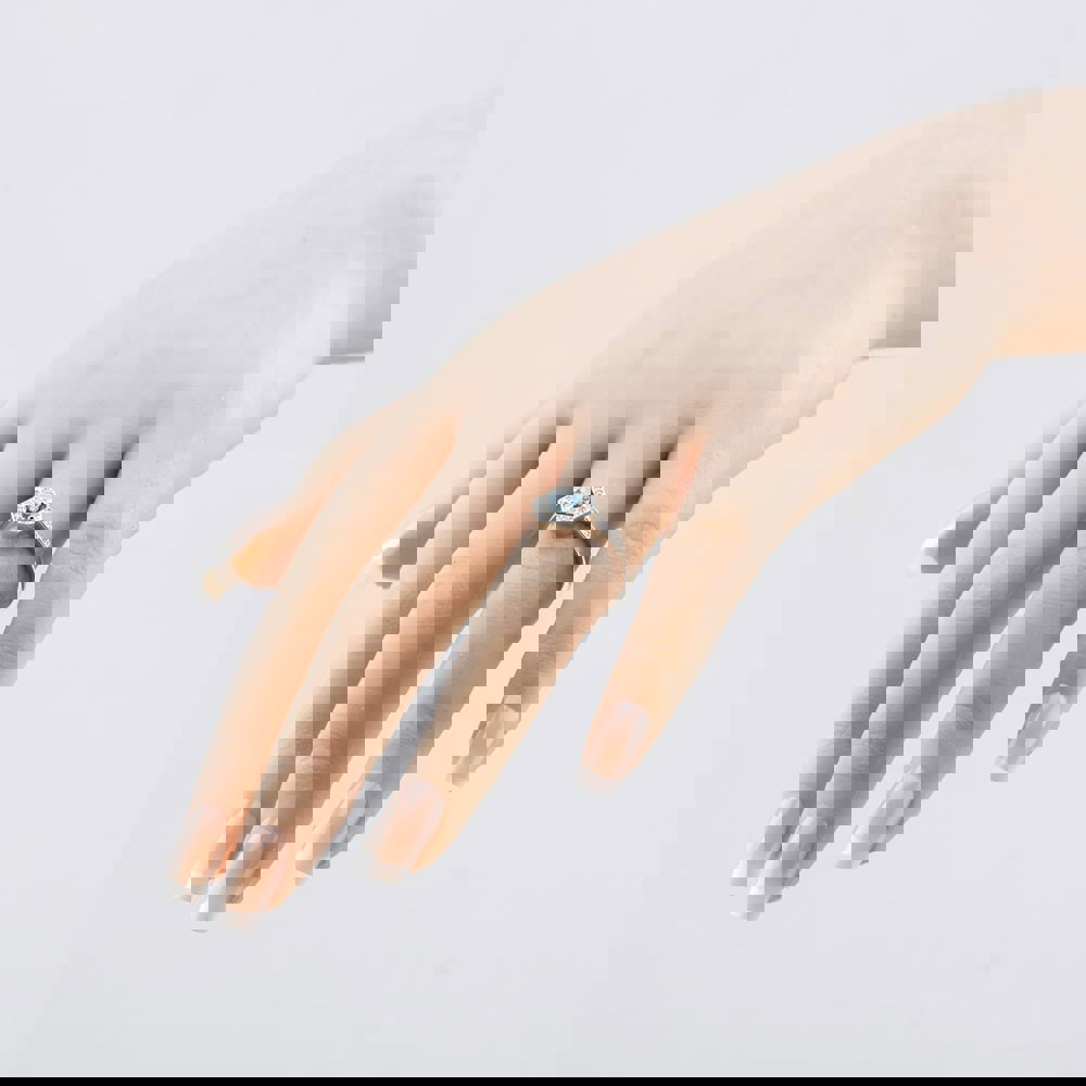 Bring a fresh pop of colour to your jewellery collection with this halo ring from T. H. Baker. The Rhodium Plated Sterling Silver Light Blue & White Cubic Zirconia Hexagon Halo Ring centres on a 5mm round light blue cubic zirconia, secured in a classic 4-claw setting for a clean, defined finish.