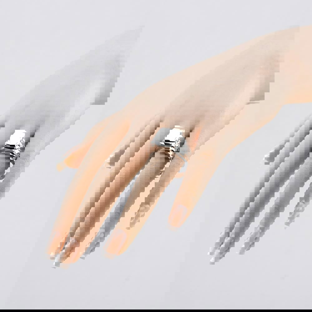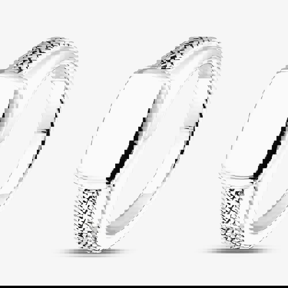 This striking square signet ring is crafted from sterling silver and enhanced with a lustrous rhodium plating for lasting shine and durability. The bold square face is perfectly complemented by a detailed braided pattern running along the band, adding texture and a touch of sophistication. A timeless piece that combines classic style with unique craftsmanship.