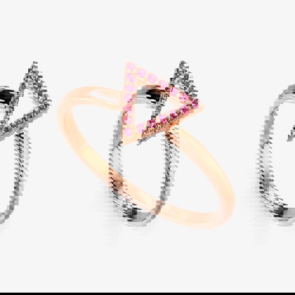 This unusual ring features pink Cubic Zirconia arranged in a triangle and set in a rose gold plated band. A unique ring that will add a touch of colour to any outfit.