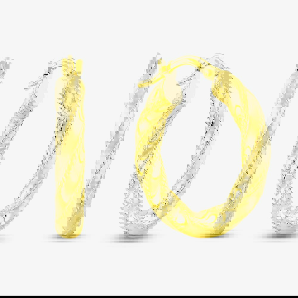 Featuring a bold twist design and intricate patterned detailing, these gold plated sterling silver hoop earrings are a must have for your jewellery collection. Perfectly lightweight and effortlessly stylish, they add the perfect touch of sparkle and sophistication to any outfit.