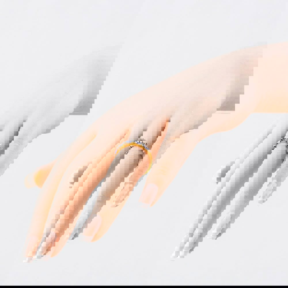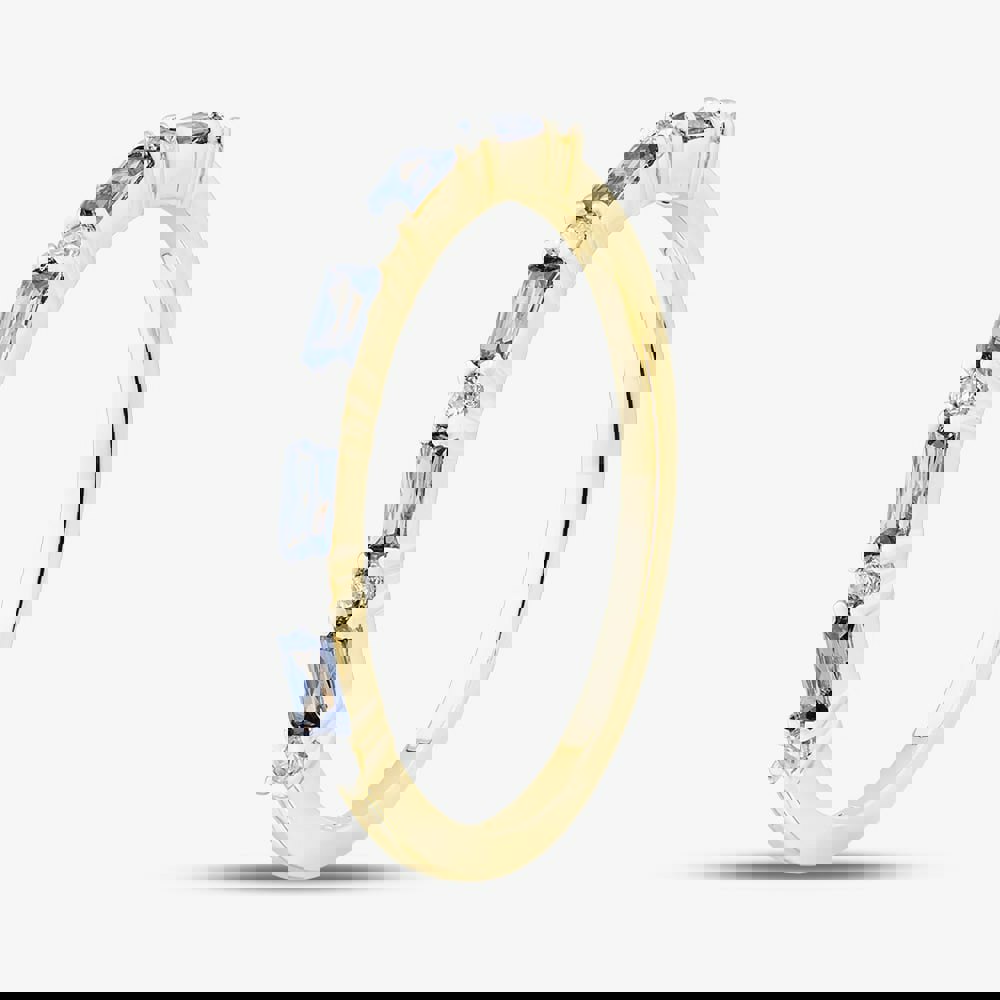 A captivating sterling silver half eternity ring showcasing baguette-cut blue cubic zirconia stones, beautifully complemented by brilliant-cut white cubic zirconia stones. This elegant design blends rich colour with classic sparkle for a refined and timeless look.