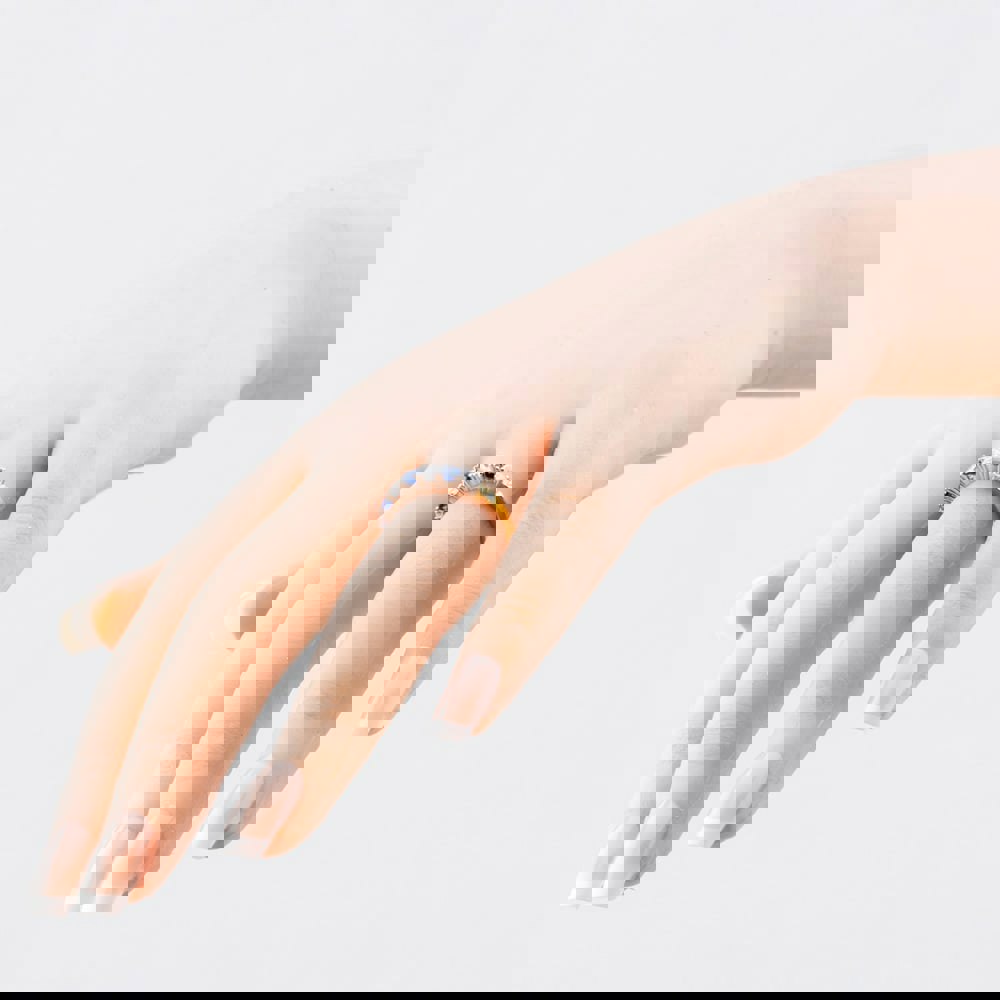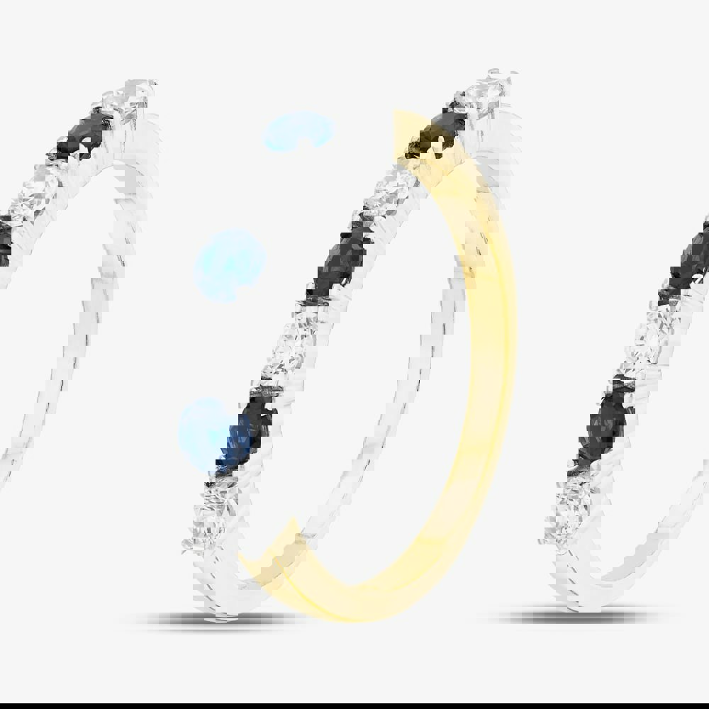 Crafted from gold plated sterling silver, this half eternity ring features seven brilliant-cut cubic zirconia stones arranged in an alternating pattern of dazzling white and vivid blue. Its striking design offers a perfect blend of classic elegance and vibrant colour.