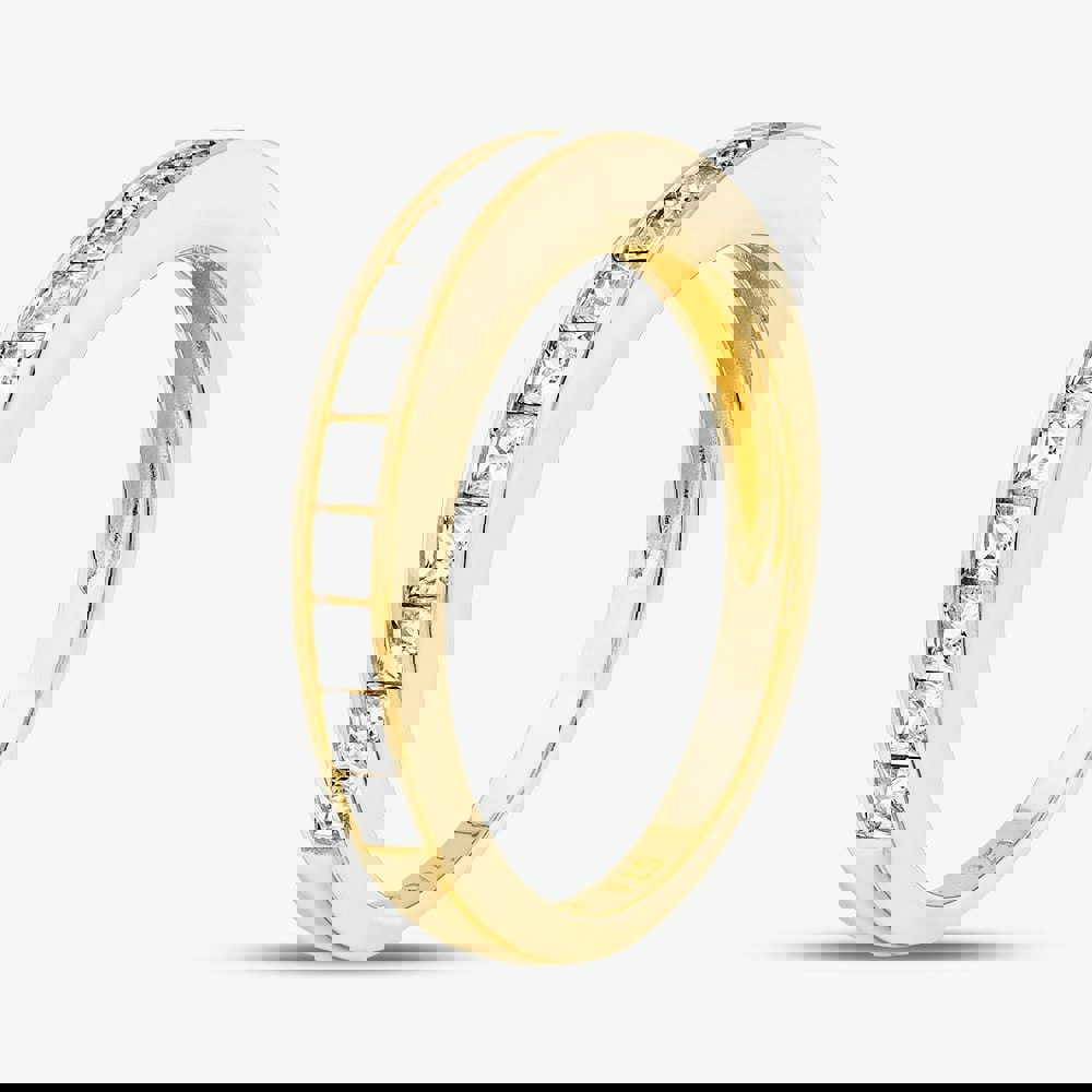 A timeless gold plated sterling silver half eternity ring adorned with a continuous row of sparkling cubic zirconia stones, offering elegant brilliance and classic charm.