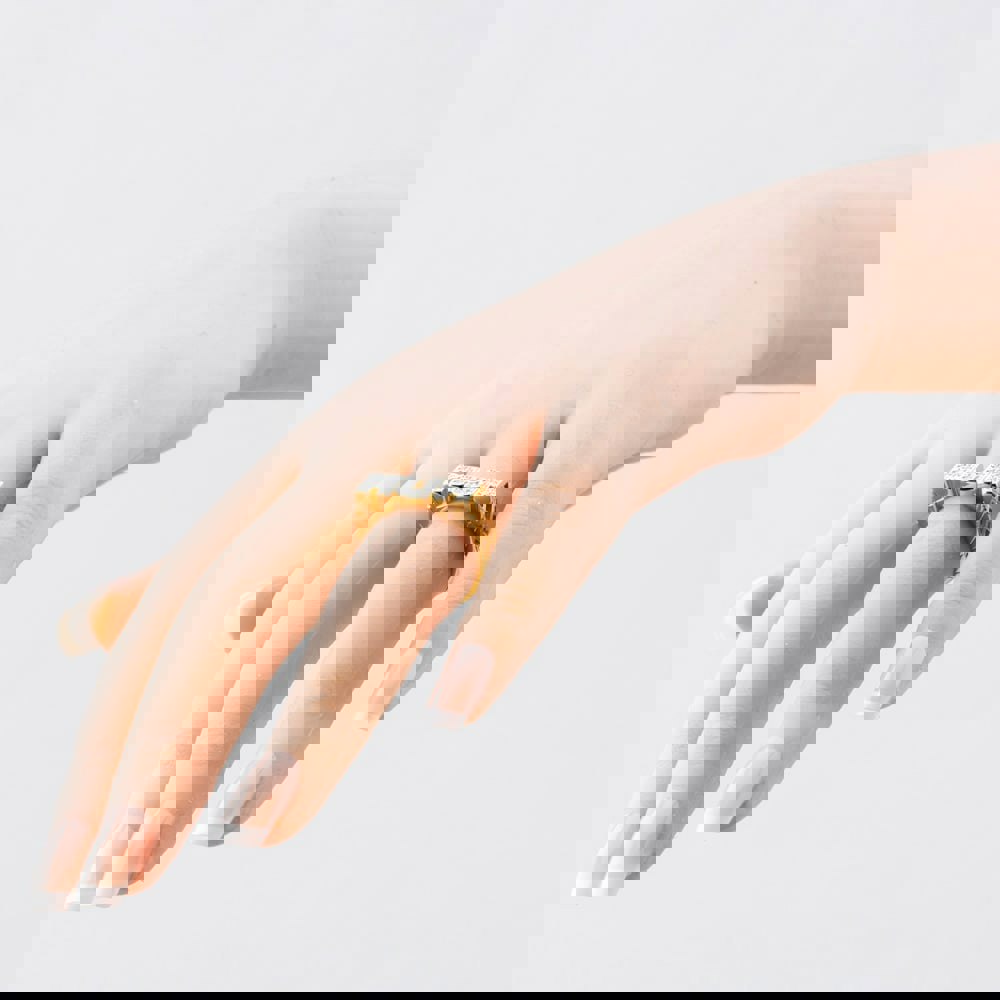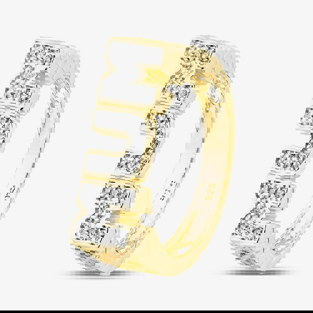 A beautiful gold plated sterling silver Mum signet ring adorned with sparkling white cubic zirconia stones, blending heartfelt sentiment with elegant shine for a timeless tribute.