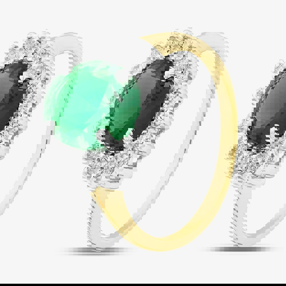 A gold plated sterling silver halo ring featuring a captivating oval-cut green cubic zirconia at its centre, surrounded by a shimmering halo of brilliant-cut white cubic zirconia stones for a radiant, timeless look.