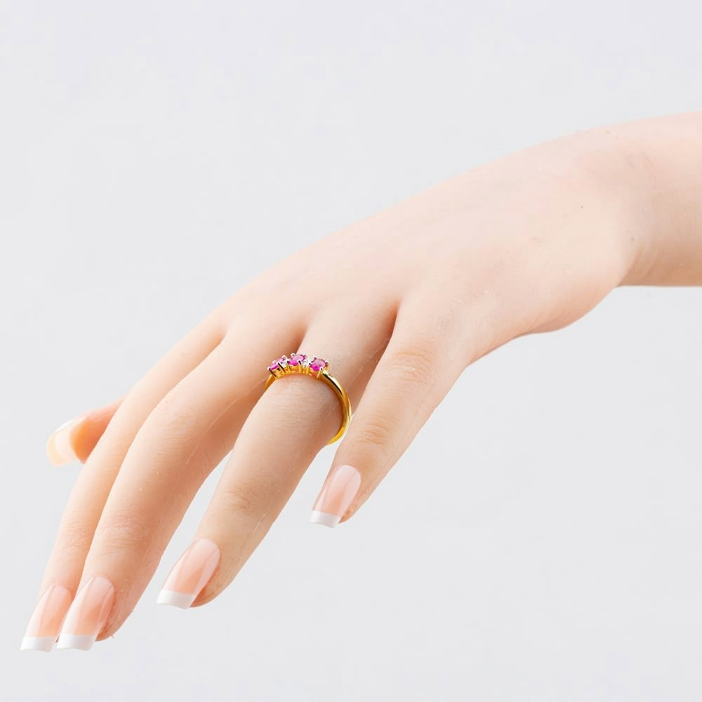 A timeless gold plated sterling silver ring featuring three oval-cut red cubic zirconia stones as the centrepiece, beautifully accented with brilliant-cut white cubic zirconia stones. This elegant design combines vibrant colour with classic sparkle for a striking, refined look.