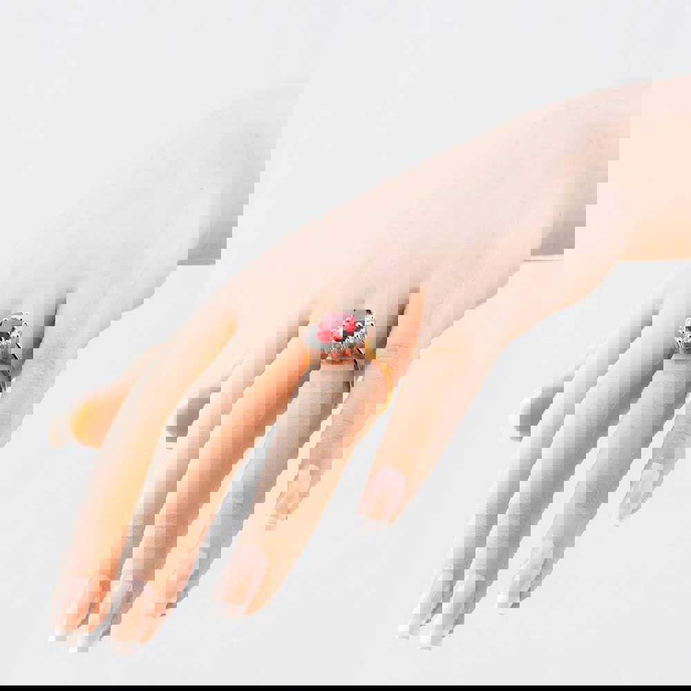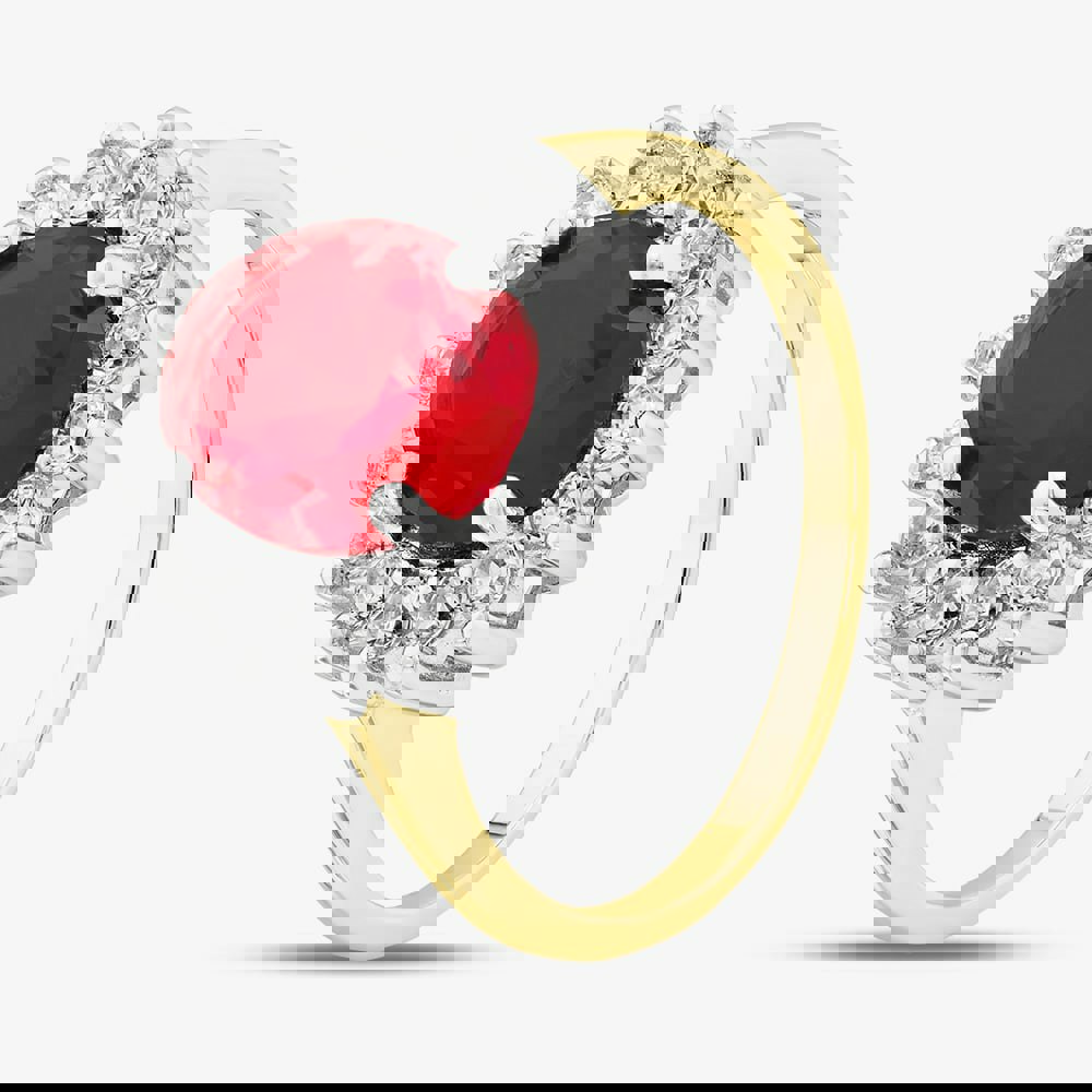 A dazzling gold plated sterling silver halo ring featuring a large oval-cut red cubic zirconia at its centre in a four claw setting, surrounded by a radiant halo of white brilliant-cut cubic zirconia stones. This striking design exudes elegance and timeless glamour.