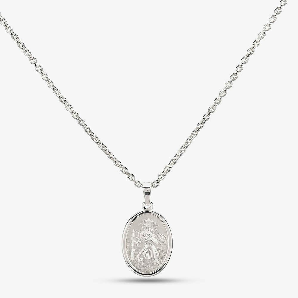 This chain features a classic medallion design realised in stunning silver. This embossed silver disc features a depiction of the religious figure the patron saint of travellers St. Christopher. Whether bought as a gift or for yourself this medallion is sure to bring you luck.