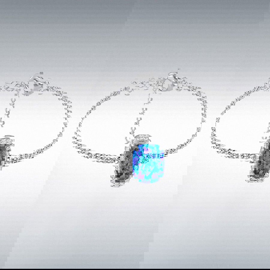 A rectangle synthetic blue opal sits at the heart of the design, framed by a halo of white cubic zirconia for added light and contrast. The adjustable fit and lobster clasp keep it secure on the wrist, while the multi-coloured synthetic stone detail adds a distinctive touch.