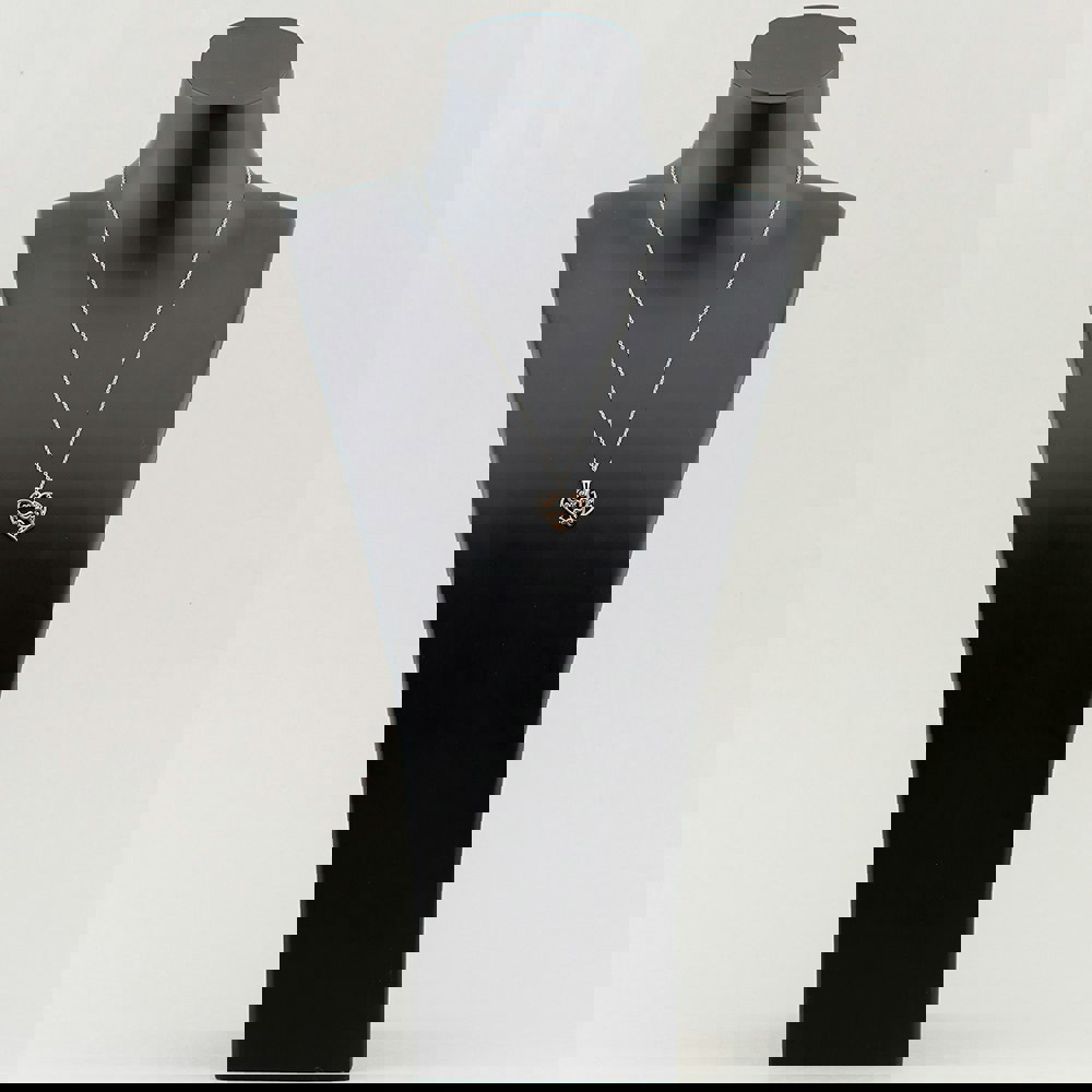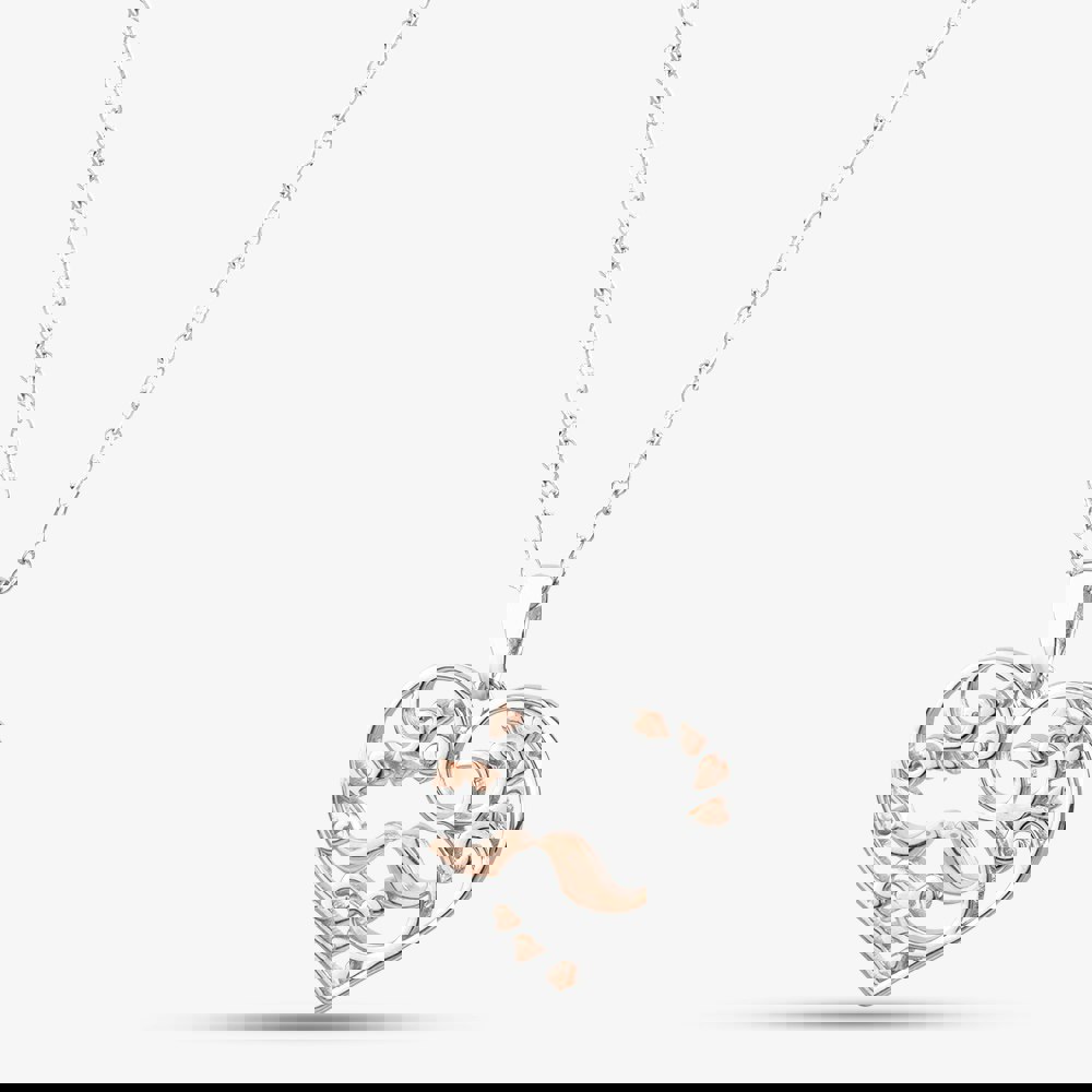 An elegant sterling silver necklace featuring a cut-out patterned heart pendant with exquisite rose gold plating. Suspended on a fine trace chain, it’s a stunning blend of sophistication and charm.