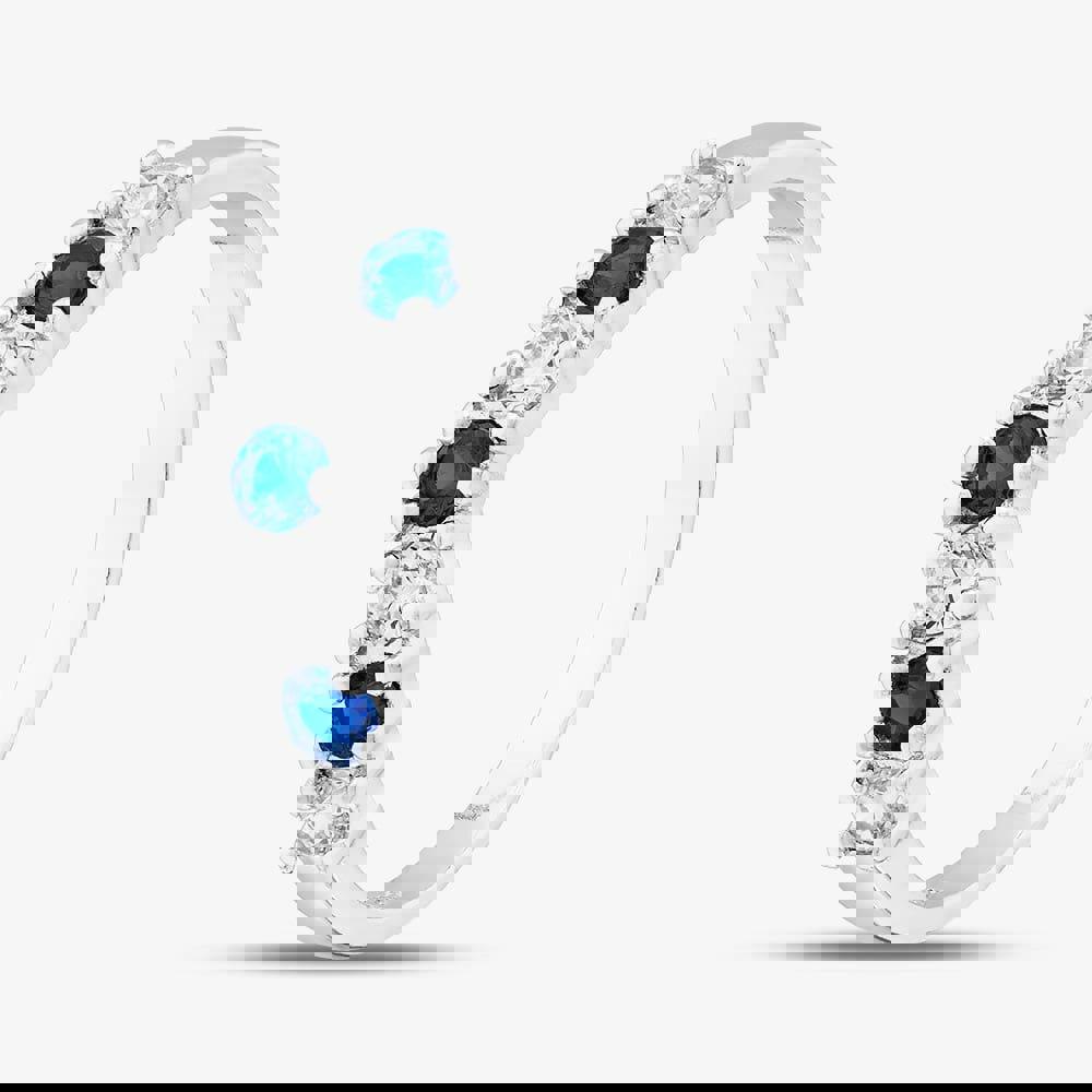 A refined addition to any jewellery collection, the T. H. Baker Wishbone Ring S2219 is crafted in sterling silver with a graceful open wishbone silhouette. Alternating blue and white brilliant-cut cubic zirconia stones bring a crisp contrast and a clean, contemporary sparkle, while the slim profile keeps the look light and easy to style.
