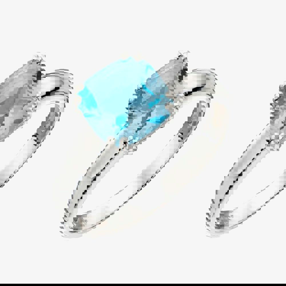 Polished sterling silver brings a clean, refined finish to the T. H. Baker Cushion Cut Blue Topaz Solitaire Ring. Centred with a cushion-cut blue topaz, the faceted stone catches the light for a crisp flash of colour. A classic four-prong setting keeps the focus on the solitaire, giving the design a timeless profile that pairs easily with everyday styling or more considered looks.