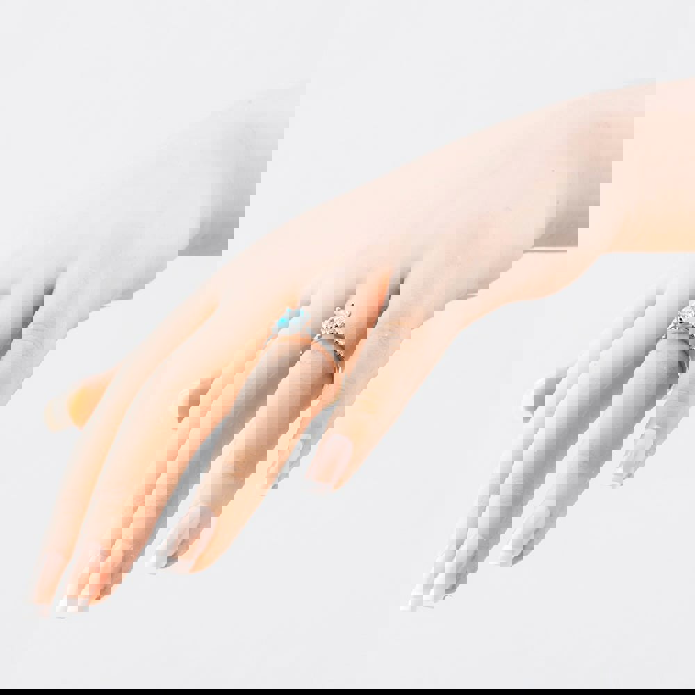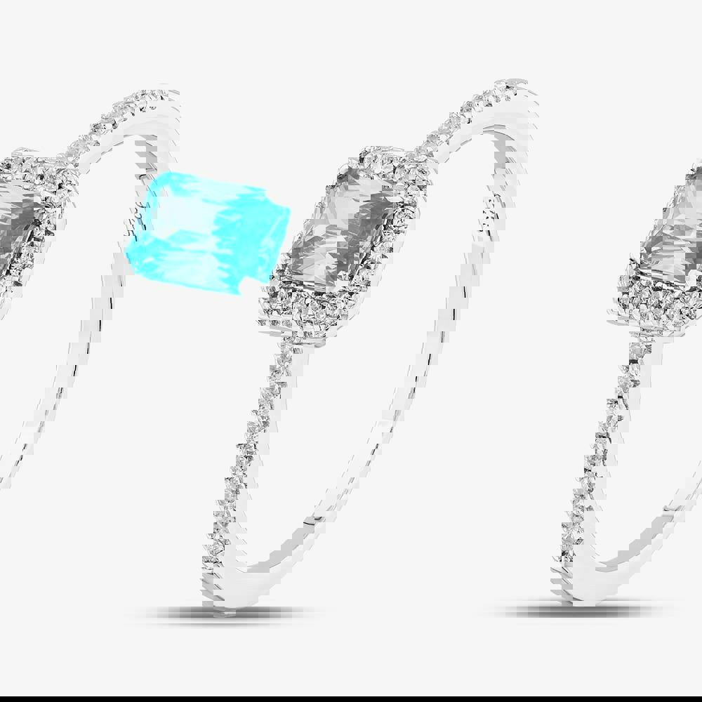Sleek sterling silver brings a polished finish to the T. H. Baker cluster ring, centred with an emerald-cut blue cubic zirconia. A halo of white cubic zirconia frames the centre stone for crisp contrast and added sparkle, while cubic zirconia accents continue along the shoulders to catch the light from every angle. Refined and eye-catching, the S2157B ring offers a considered balance of colour and brilliance that works beautifully as a statement piece.