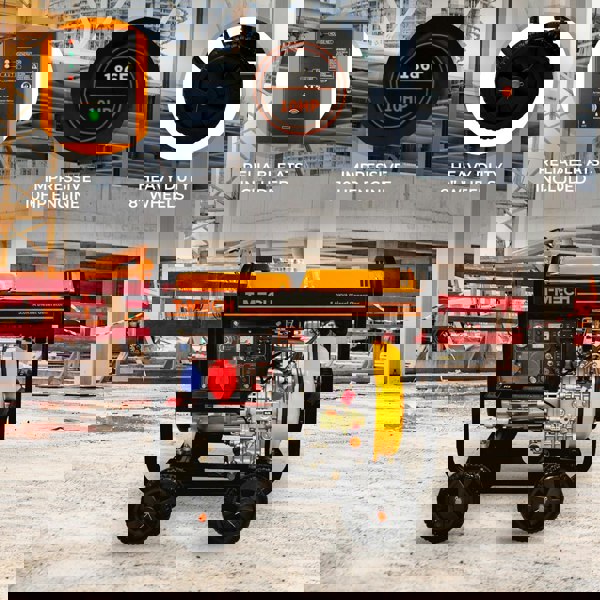 Made from a strong powder coated steel the generator is incredibly resistant to scratches and corrosion to ensure it stays looking good and delivers a consistent powerful performance for a long time to come. The clean black with orange detailing finish creates a truly unique design which will blend in seamlessly to your surroundings. Although open framed, the machine is moderately quiet when in use, just 77 dB at 7m, for a more pleasant experience. Moving the generator around is made easy with the 4 heavy duty 8” wheels and sturdy fold in/ out handles, which are fitted to the industrial frame design.