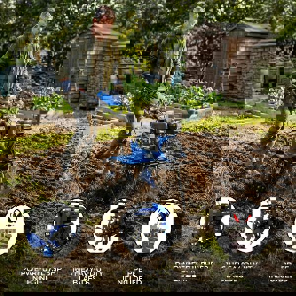 An adjustable tilling width of 800–1000mm helps you balance coverage with control, and the 100–300mm working depth supports everything from lighter cultivation to deeper soil preparation. Sixteen heavy-duty blades are arranged in four groups on each side, with a 360mm rotation radius and 0.55cm thickness for reliable soil penetration and an even finish. Manoeuvring is made easier with 4.0-8” tyres and an up/down handlebar adjustment of 60°, helping you find a comfortable working position. Recoil start provides dependable starting, and the rotavator runs on unleaded petrol.
