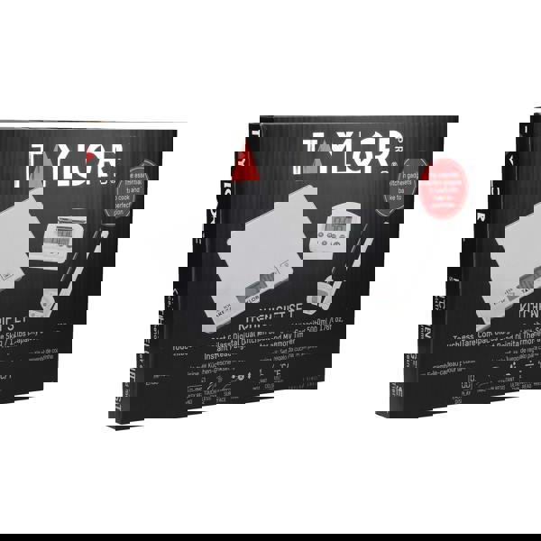 This three-piece gift set from Taylor Pro provides precision whether you're cooking, baking or barbecuing. It consists of a digital food probe thermometer, a 24-hour digital kitchen timer and a set of digital scales - all featuring a simple silver finish. Accurately weigh dry and liquid ingredients with the scales. They're designed to reduce mess and improve hygiene. The clever Touchless Tare technology allows the display to be sent back to zero with a simple hand wave, while the stain-resistant glass platform can be wiped clean easily after use. With its instant-read sensor, the thermometer provides accurate temperature readings in °C and °F. It's ideal for ensuring meat, fish and poultry are safely cooked, and is handy for jam and sweet making too. The digital kitchen timer features a 24-hour time range, as well as a useful memory recall function. It also features a built-in magnet, a stand and a large screen, so it can easily be displayed in the kitchen. Includes a 20-year guarantee. Timer and thermometer: Five year guarantees