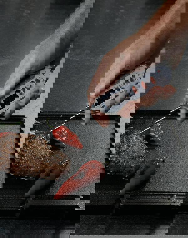 Home made burgers, marinated fish fillets or an entire roasted chicken. . . Make sure your food is cooked right the way through and ready to serve, with the Taylor Pro digital food thermometer probe. Its super bright LED display makes it easy to read temperatures. Even in the most dimly lit kitchen or cooking environments you'll be able to read from this red and black display. Just insert the ultra-thin stainless steel probe into your food. With its tapered design, it'll leave a smaller hole in your meat, fish or poultry, which helps to prevent those all-important juices and flavours escaping during cooking. It also leaves your food looking great for serving. The digital thermometer will then provide an accurate core temperature reading, between -50°C to 200°C (-58°F to 392°F), allowing you to ensure your food is absolutely safe for serving. Includes a five-year guarantee.