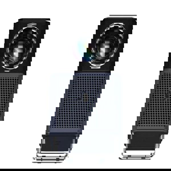 The aluminium handle works as a stand that can position the projector down at a 15 degree angle.