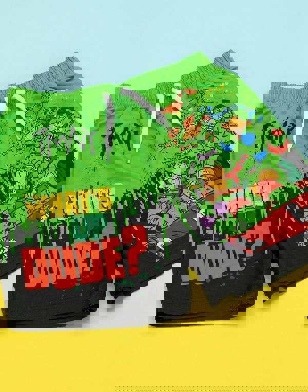 The swimming trunks come in black with a cool green paint splatter effect and feature the TMNT logo and characters skateboarding with the phrase 'what's up dude?' printed in vibrant graphics