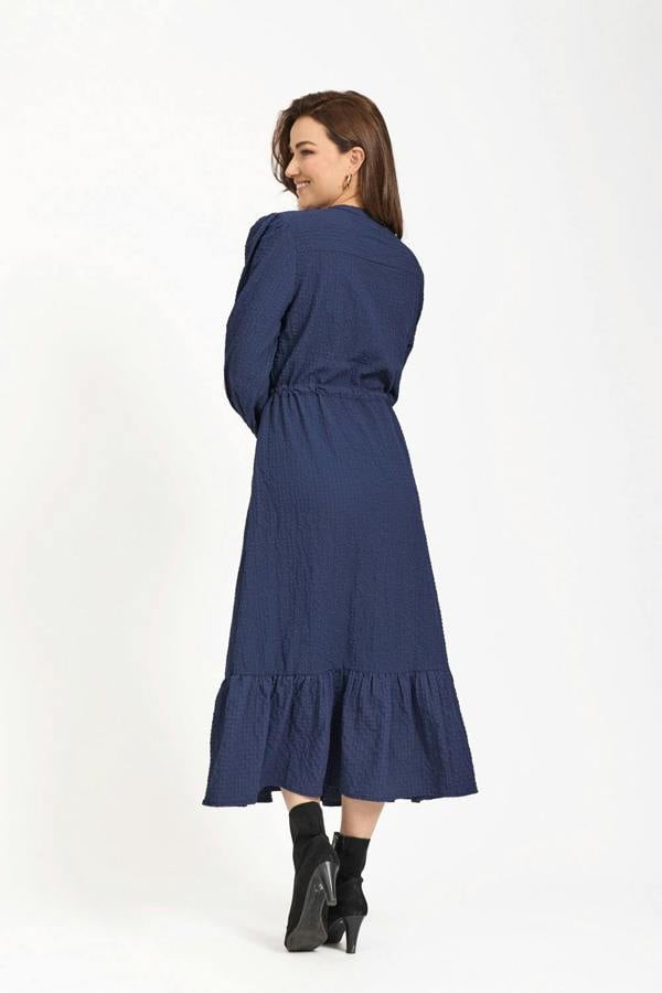 Our Textured Flared Midi Dress offers both style and comfort, making it a versatile choice for various occasions. The dress is designed with a relaxed fit with a waist-cinching tie, enhancing your natural shape while providing an adjustable fit. The notch neck and long sleeves add a touch of sophistication, while the ruffled hem adds a subtle feminine flair. Perfect for transitioning between seasons, this dress can be dressed up or down with ease.