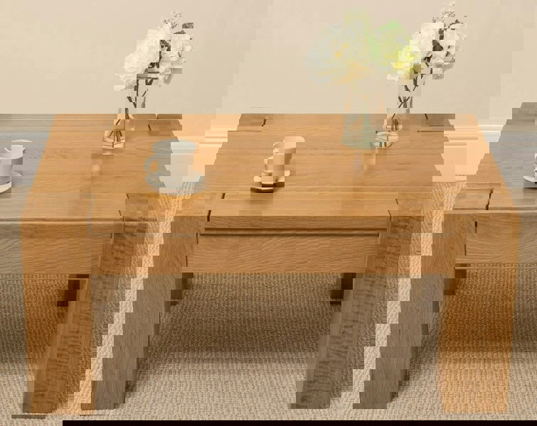 The ideal centre table for your living room, the Kuba wooden table is sure to make a statement in your home. Made from thick cuts of chunky solid oak wood, the Kuba small oak coffee table is a sturdy solid piece of contemporary light oak furniture.