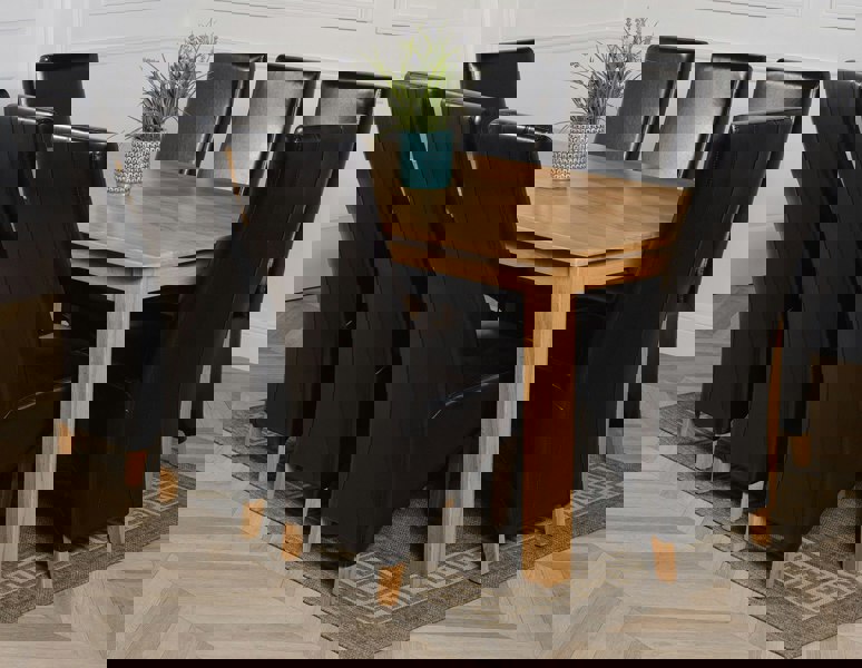 The Oslo solid oak dining table and chairs set will look great in any contemporary home. This is the largest table of the Oslo range, neatly proportioned with clean lines and square set legs, the size of this oak dining room table and chairs makes it perfect for hosting dinner parties and special occasions alike.