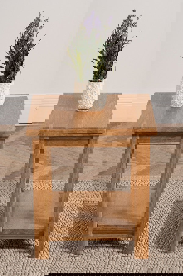 Perfectly proportioned, measuring 45 x 45 cm, the Oslo oak lamp table, offers sophisticated style and practicality in one compact solution. The Oslo lamp table provides the perfect hub for snacks and drinks, magazines and other living room essentials. Versatile and practical, the Oslo lamp table can even be used as a bedside table or oak side table. Featuring a handy shelf, the Oslo lamp table not only looks great but it's packed full of handy storage space for those newspapers and TV remotes.
